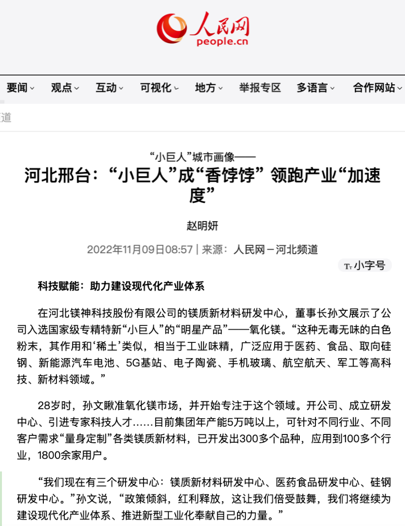 昨天(11月9日),人民網(wǎng)-河北頻道,報道了“小巨人”城市畫像《河北邢臺:“小巨人”成“香餑餑” 領跑產(chǎn)業(yè)“加速度”》關注了邢臺的四家小巨人企業(yè),以及邢臺市政府對這些中小企業(yè)的培育體系和扶持政策..熱線電話